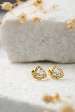 The Mini Pixie Studs in Gold: Golden Magic. Bring a little fairy magic to their day with the Mini Pixie Studs in a sunny gold finish. These secure earrings showcase a sparkling triangular CZ stone, framed by a halo of tiny CZ lights. The design gives a beautiful, focused twinkle. The foundation is high-quality 925…