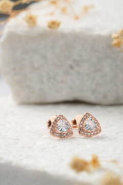 The Mini Pixie Studs in Rose Gold: Sweet Twinkle. The Mini Pixie Studs get a sweet, warm glow in a rose gold finish. The enchanting design centers on a shimmering triangular CZ stone, encircled by a dainty pave halo for extra twinkle. The studs are built on a 925 Sterling Silver base and treated with…