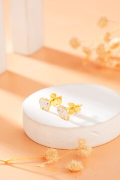 The Dreamy Moonbeam Earrings in Gold: Celestial Magic. The Dreamy Moonbeam Earrings bring a touch of the starry night sky right to their ears! Each earrings features a sweet crescent moon with a tiny star beside it, both filled with soft, comforting enamel. The white and pink colours are like gentle moonbeams and bright wishes….