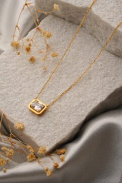 Illuminate your presence with the crisp elegance of the Contour Radiance – 925 Sterling Silver Gold-Plated Necklace from Shivaya Luxe. This delicate yet impactful piece features a brilliant, rectangular-cut stone, securely nestled within a smooth, gold-plated 925 sterling silver bezel. The distinct lines of the setting beautifully complement the stone’s inner fire, creating a seamless…