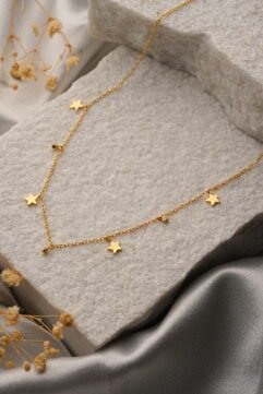Adorn your neckline with the enchanting allure of the Cosmic Charm – 925 Sterling Silver Gold-Plated Necklace from Shivaya Luxe. This captivating piece features a delicate, radiant chain crafted from genuine 925 sterling silver, beautifully enhanced with rich gold plating. Along its graceful length, multiple small, flat star-shaped charms are artfully interspersed, creating a whimsical…