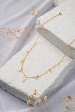 The Dew Drop Necklace in Gold: Golden Grace. Embrace effortless, classic charm with the Dew Drop Necklace in a rich gold finish. This fine-link chain is scattered with petite, lustrous pearls, each placed to catch the light like shimmering dew drops. The gentle, fluid design creates a beautiful texture against the skin, culminating in a…