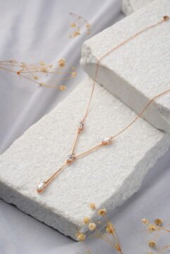 The Astral Drop Necklace in Rose Gold: Romantic Plunge. Embrace sophisticated, modern romance with the Astral Drop Necklace in a rose gold finish. This striking necklace showcases a dramatic Y-shaped drop, featuring brilliant marquise-cut cubic zirconia (CZ) stones meticulously set along the chain and the elongated pendant. The sparkle of the CZ creates an intense…