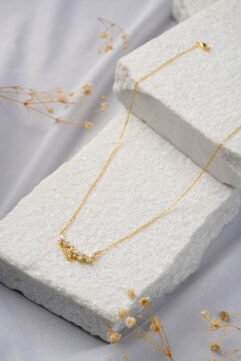The Petal Whisper Necklace in Silver: Delicate Light. The Petal Whisper Necklace is an exquisite piece of fine, nature-inspired jewellery. This horizontal pendant features a delicate arrangement of stones, where marquise and round-cut cubic zirconia (CZ) are clustered to mimic graceful petalsand foliage. The entire design sits flush and curves softly along the neckline, offering…