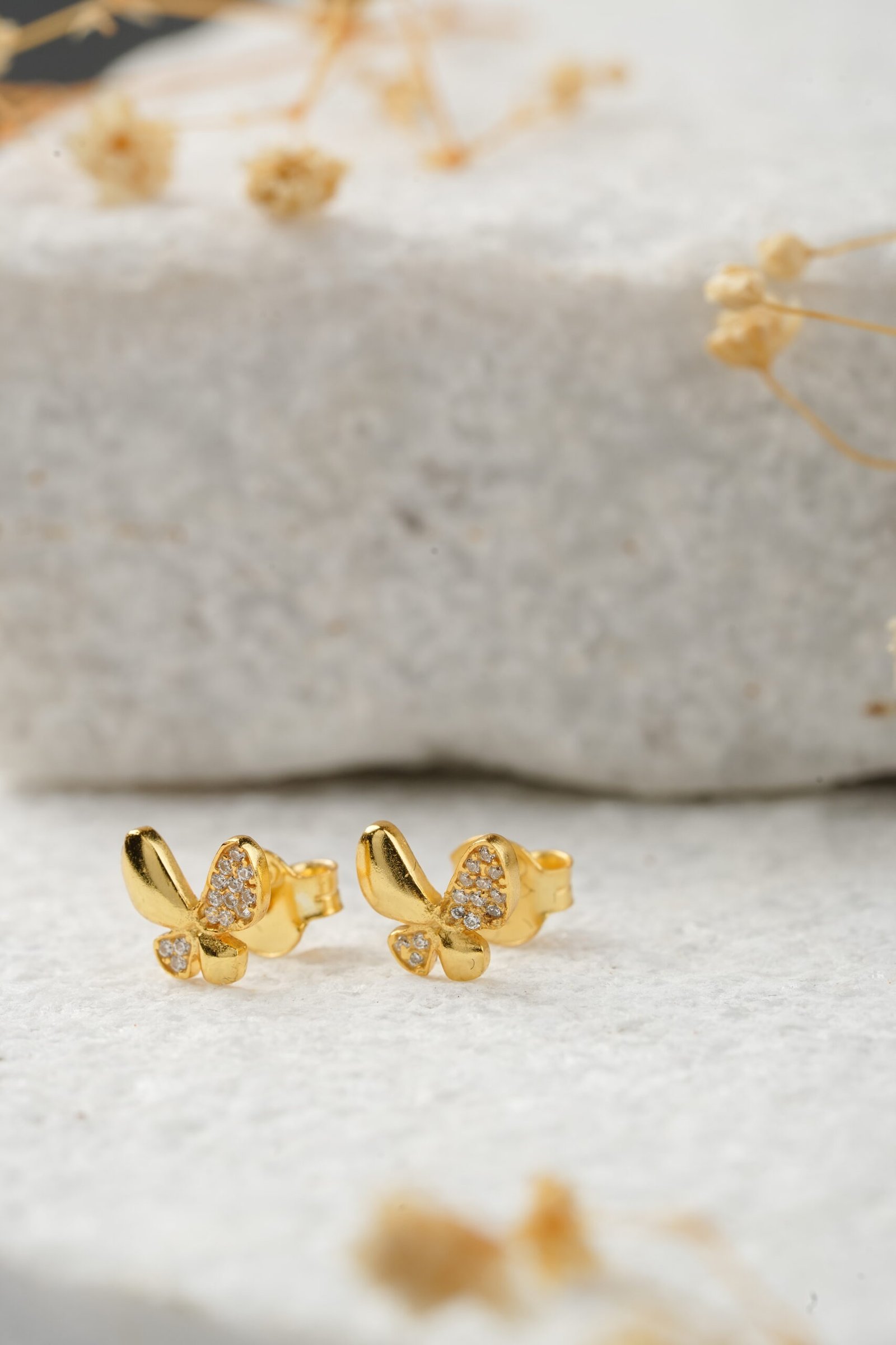 These petite butterfly studs feature a fluid, polished design, with the upper wings adorned with pave-set cubic zirconia (CZ).