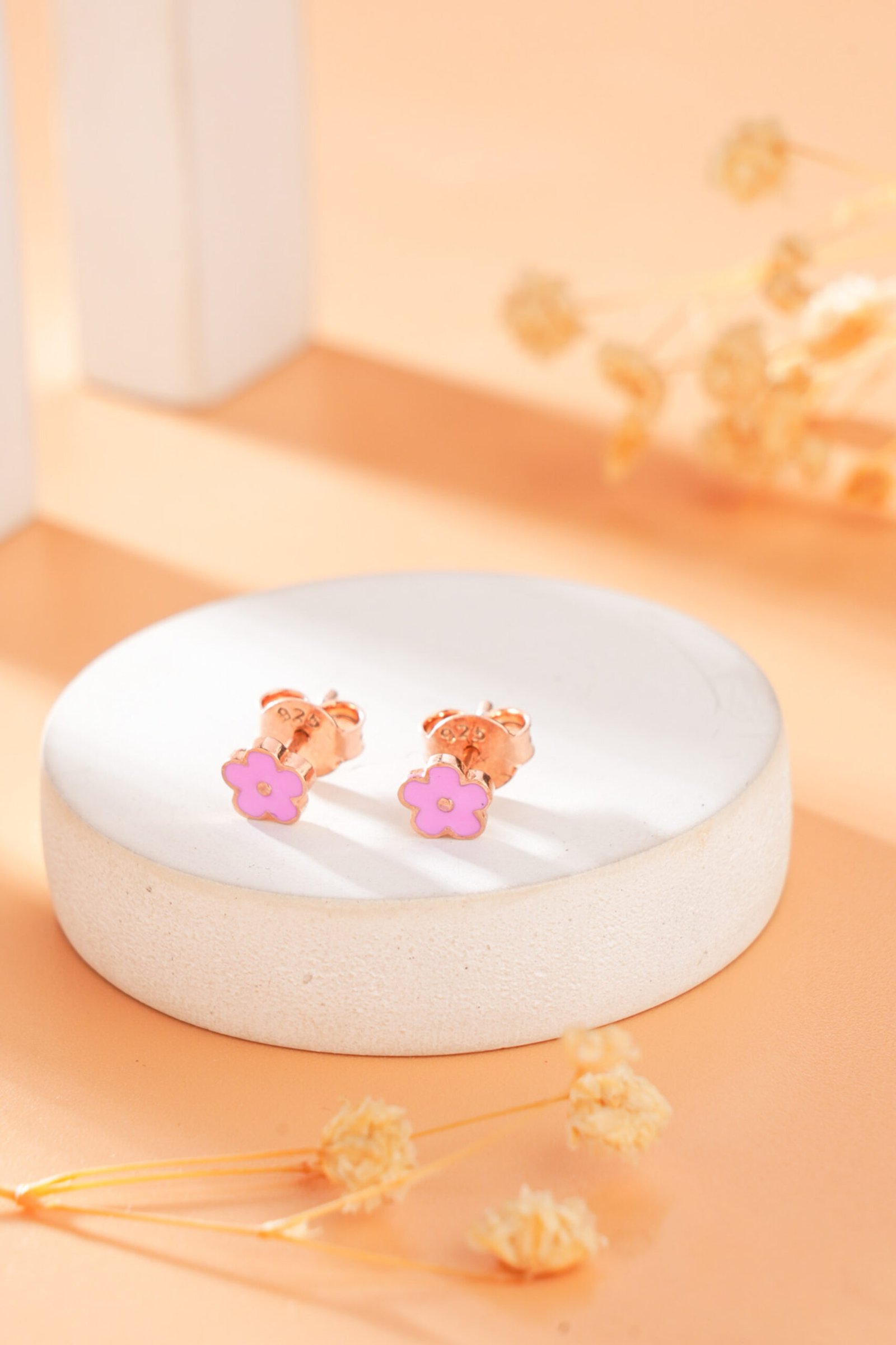This soft, blushing metallic colour complements the bright pink enamel beautifully, making these simple flower earrings a charming and delightful addition to your little one’s collection.