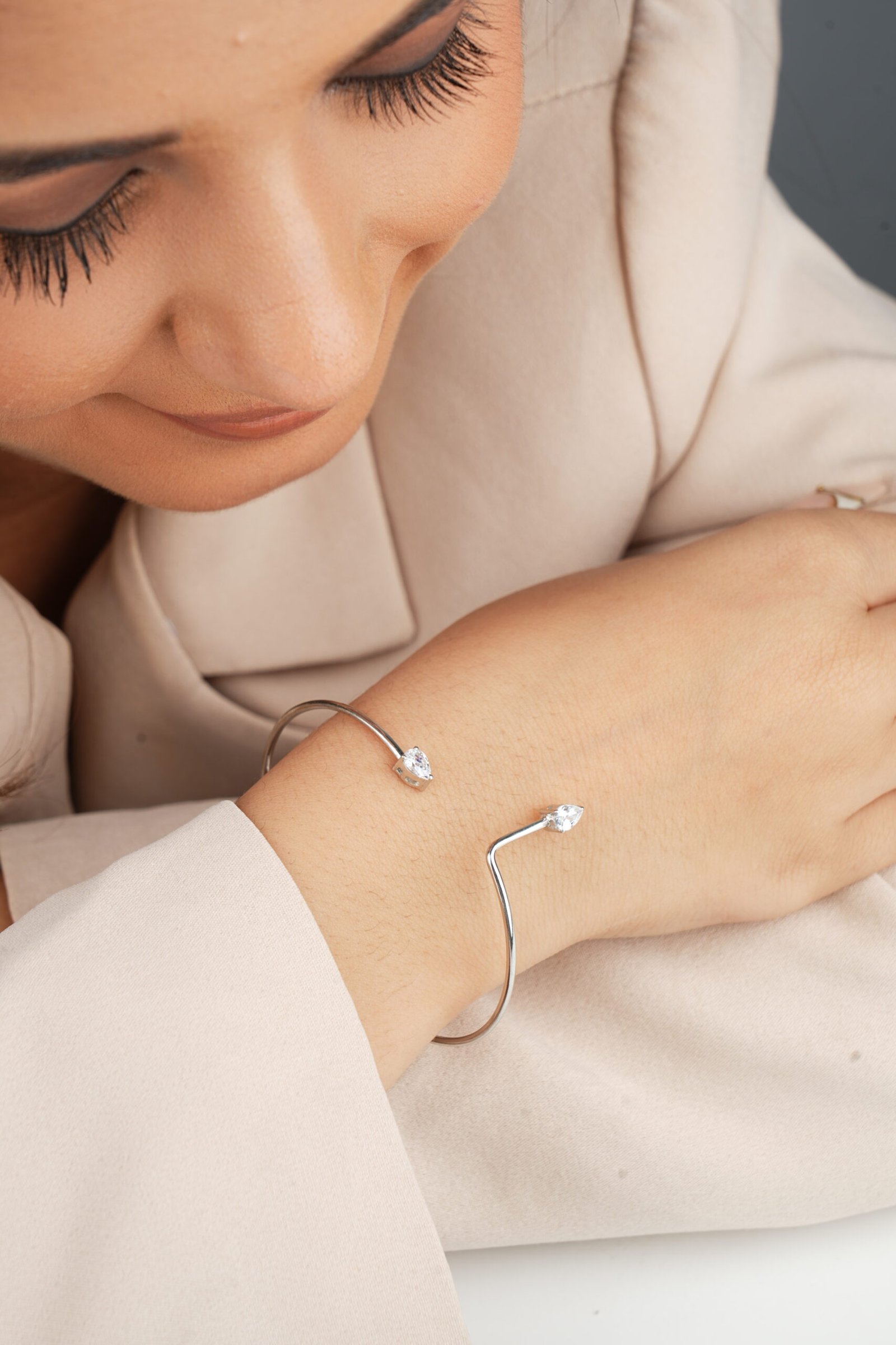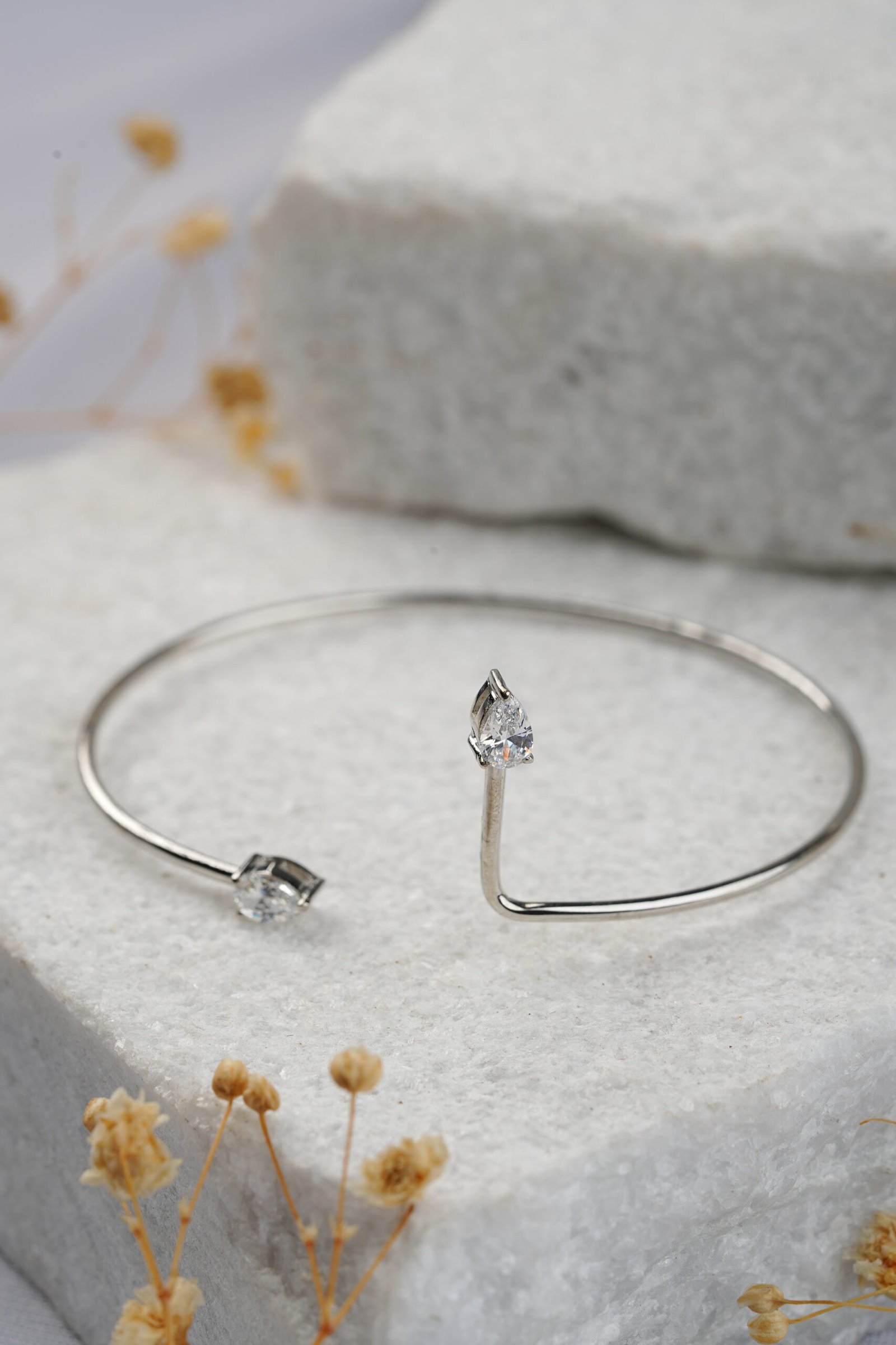 The Lumina Pear Bangle in Silver: Icy Light and Grace.