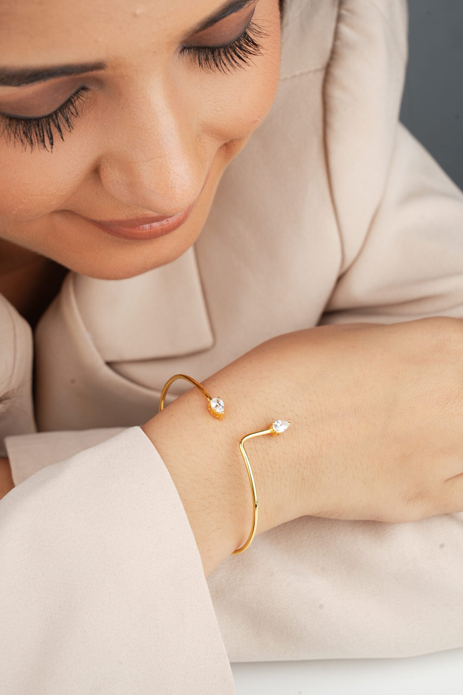 The Lumina Pear Bangle in gold is a luxurious and timeless accessory.