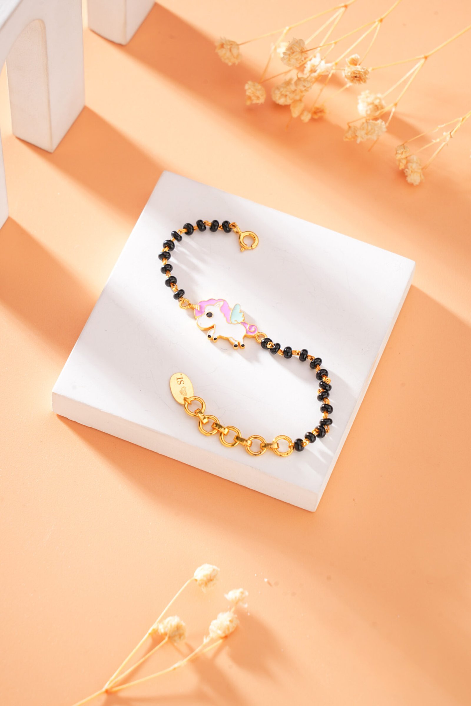 This magical creature has a golden horn and sparkling details! The charm is suspended from a fun black beaded chain.
