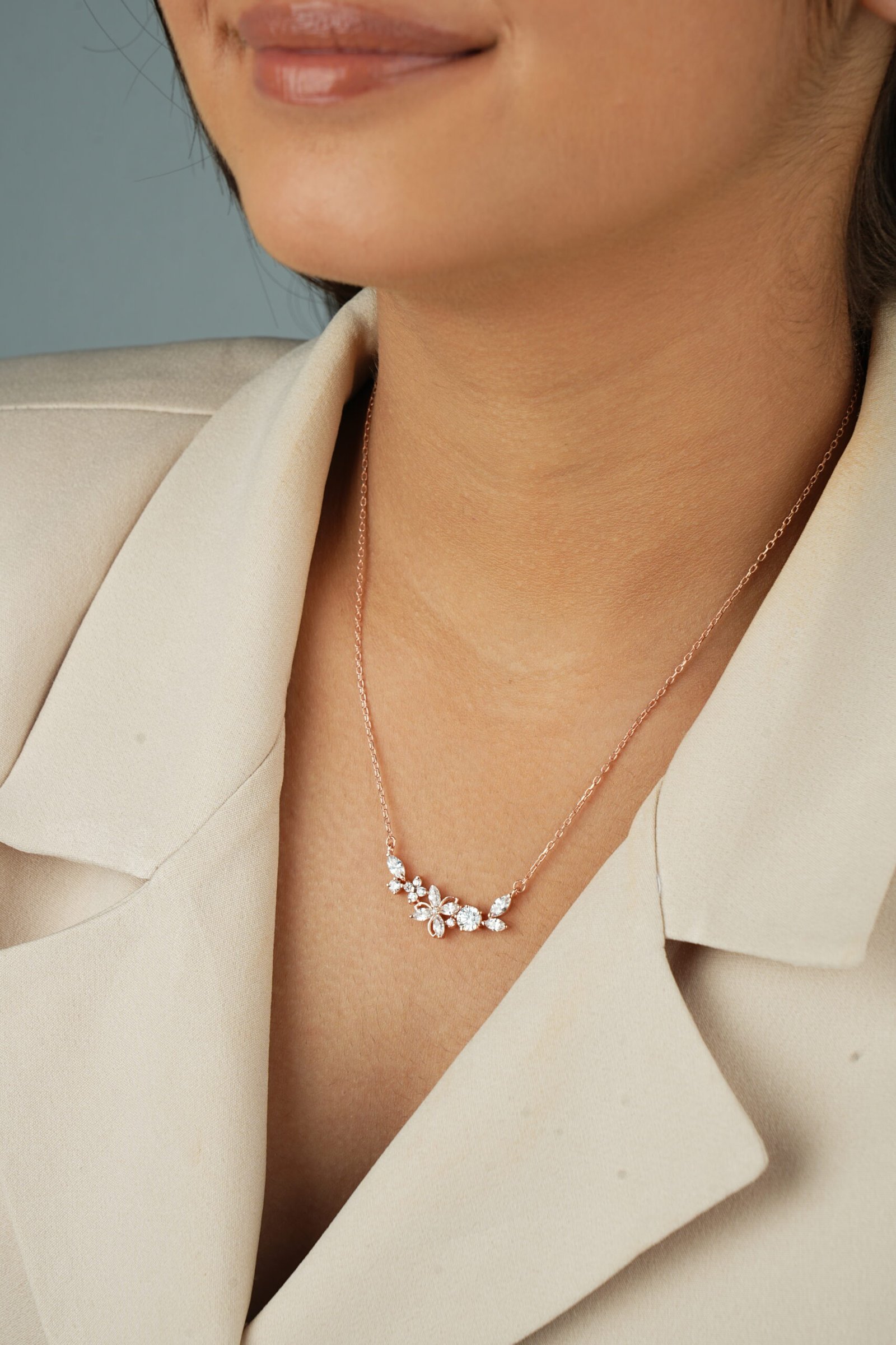 The delicate, nature-inspired motif is meticulously set with marquise and round-cut cubic zirconia (CZ), creating sparkling petals and leaves that gently hug the collarbone.