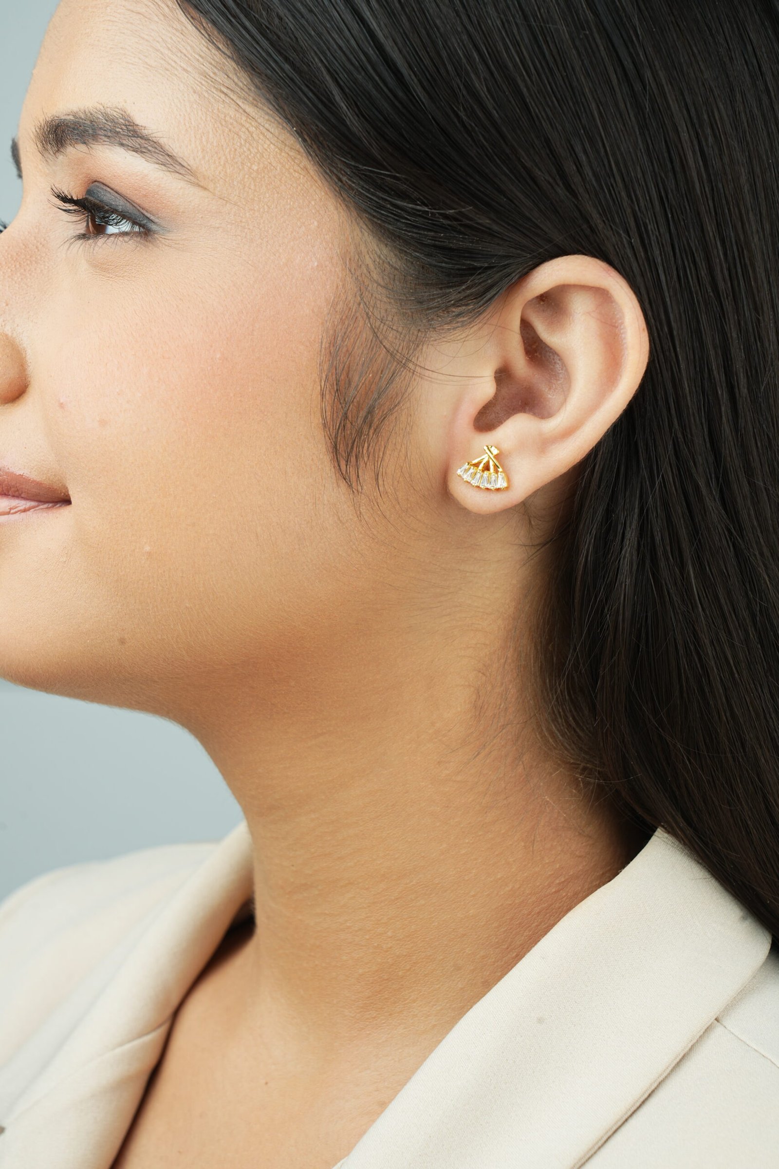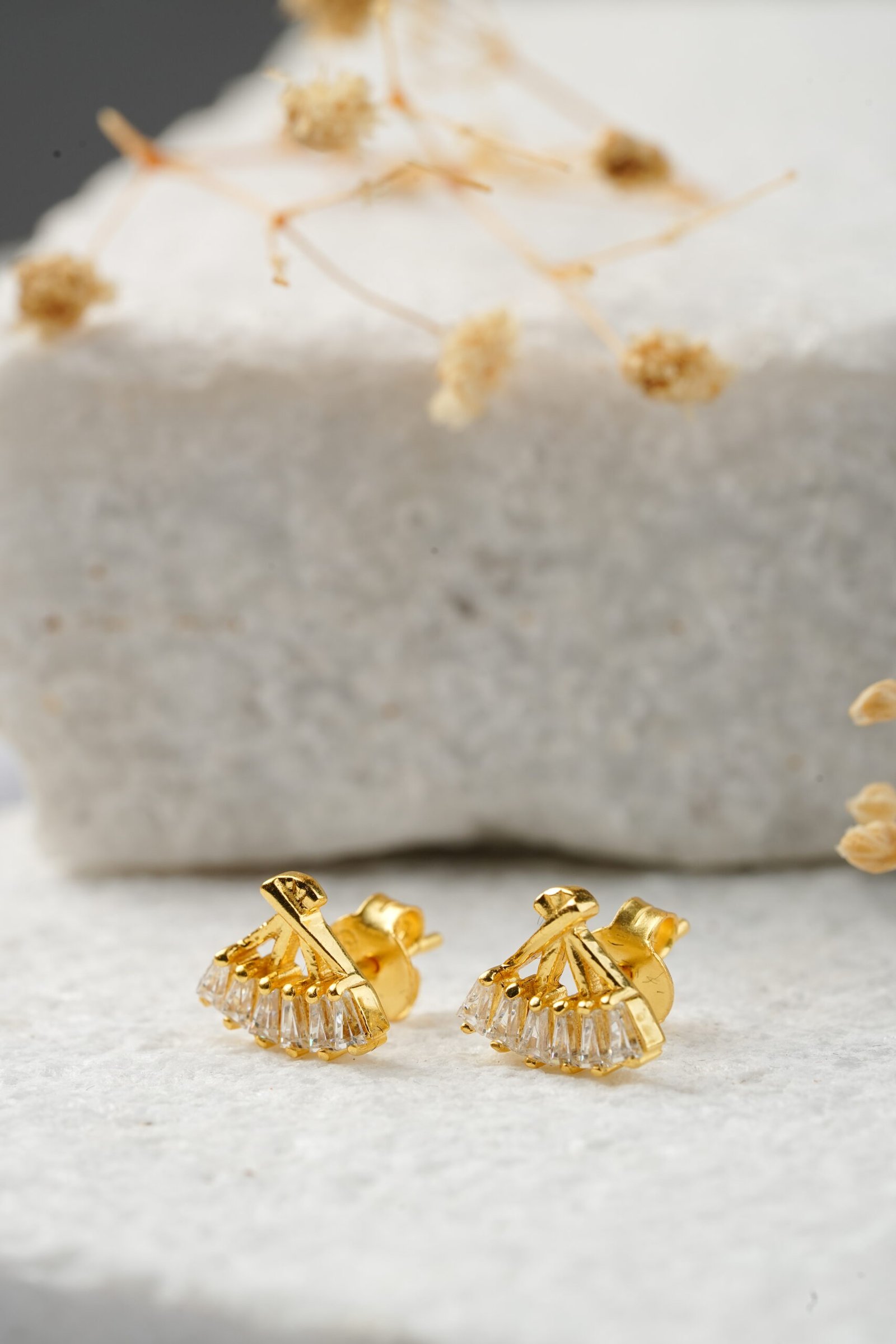 The signature fan shape showcases a flawless array of baguette-cut cubic zirconia (CZ), set to create an intense, radiating burst of light that catches the eye from every angle.