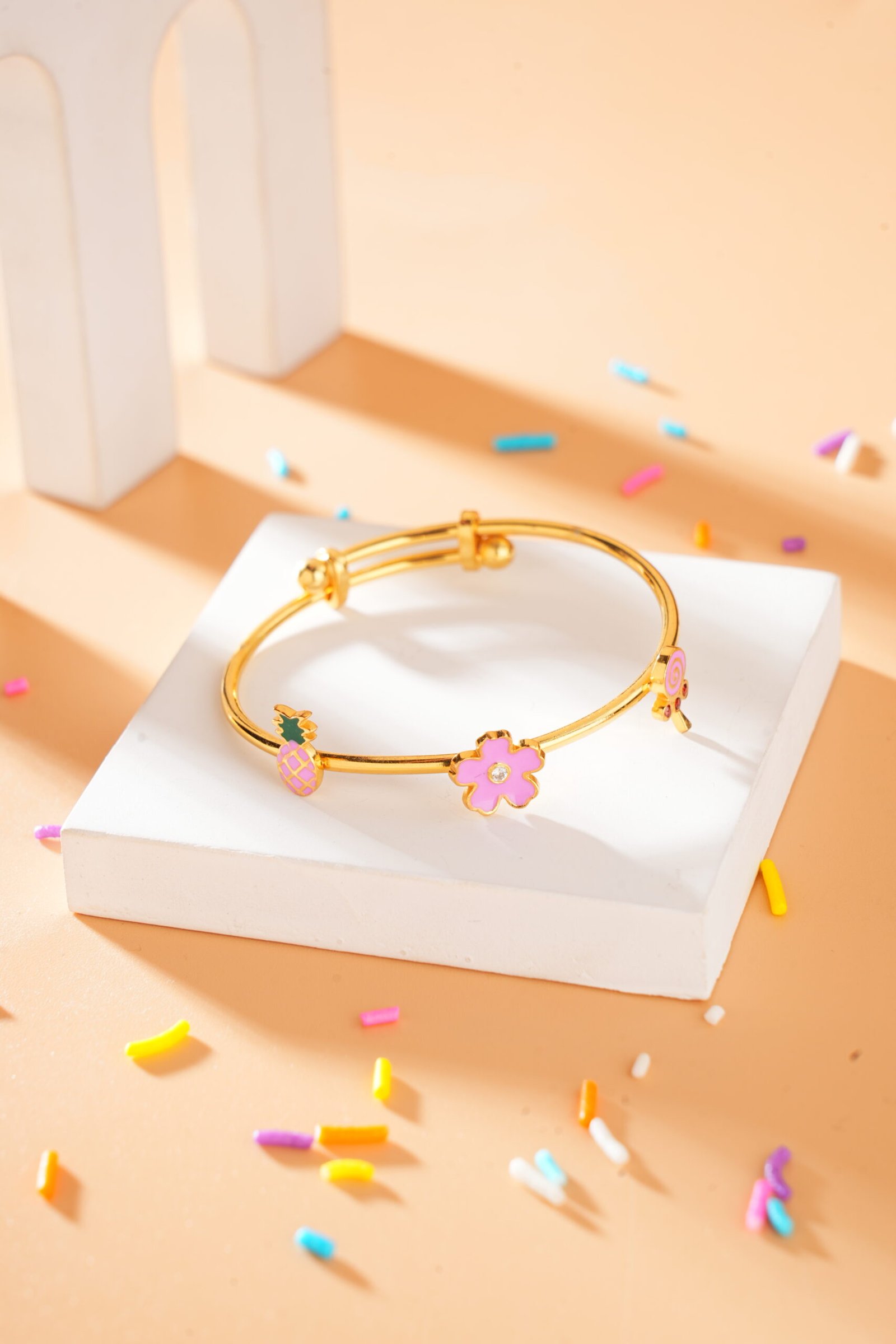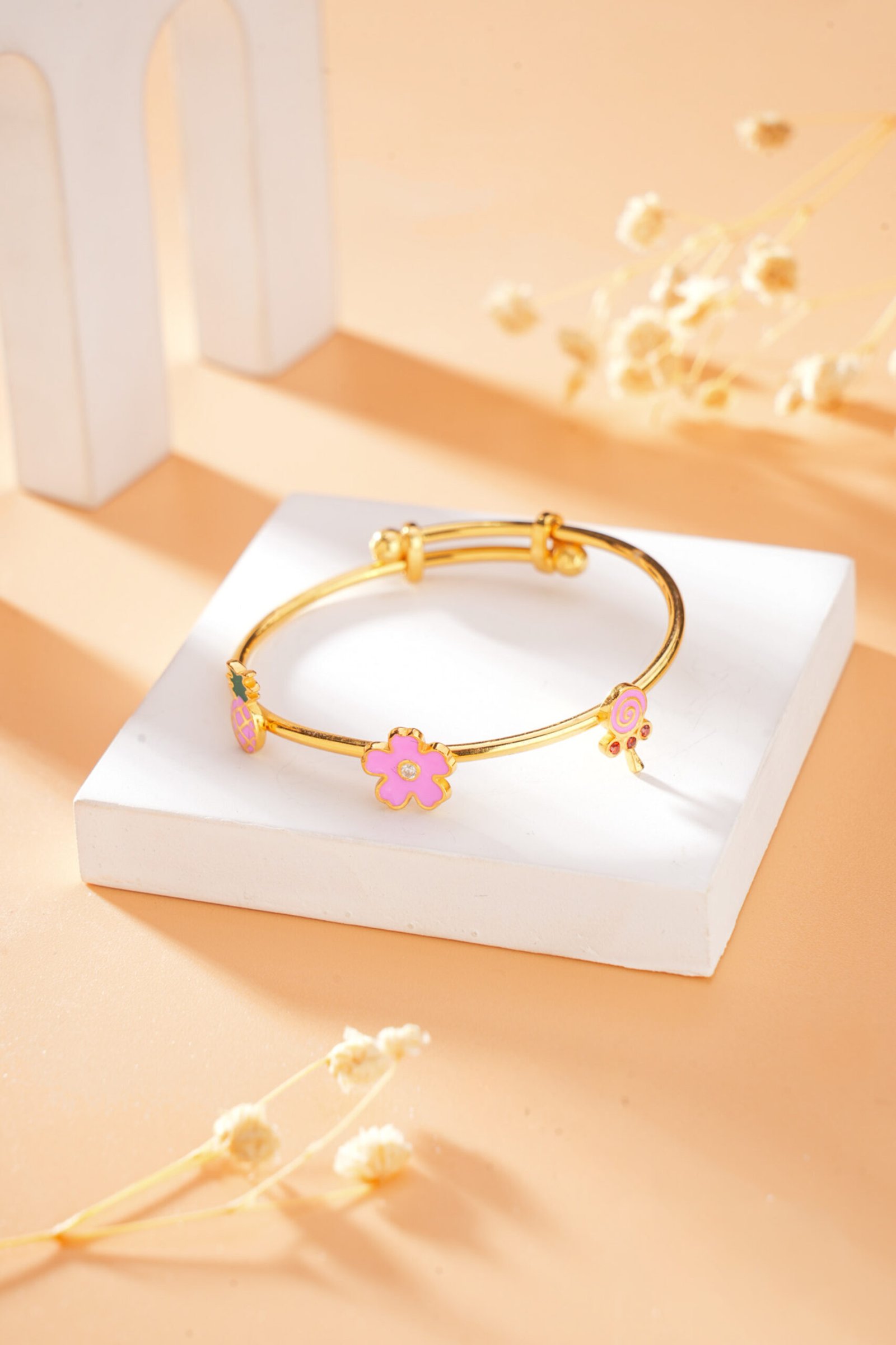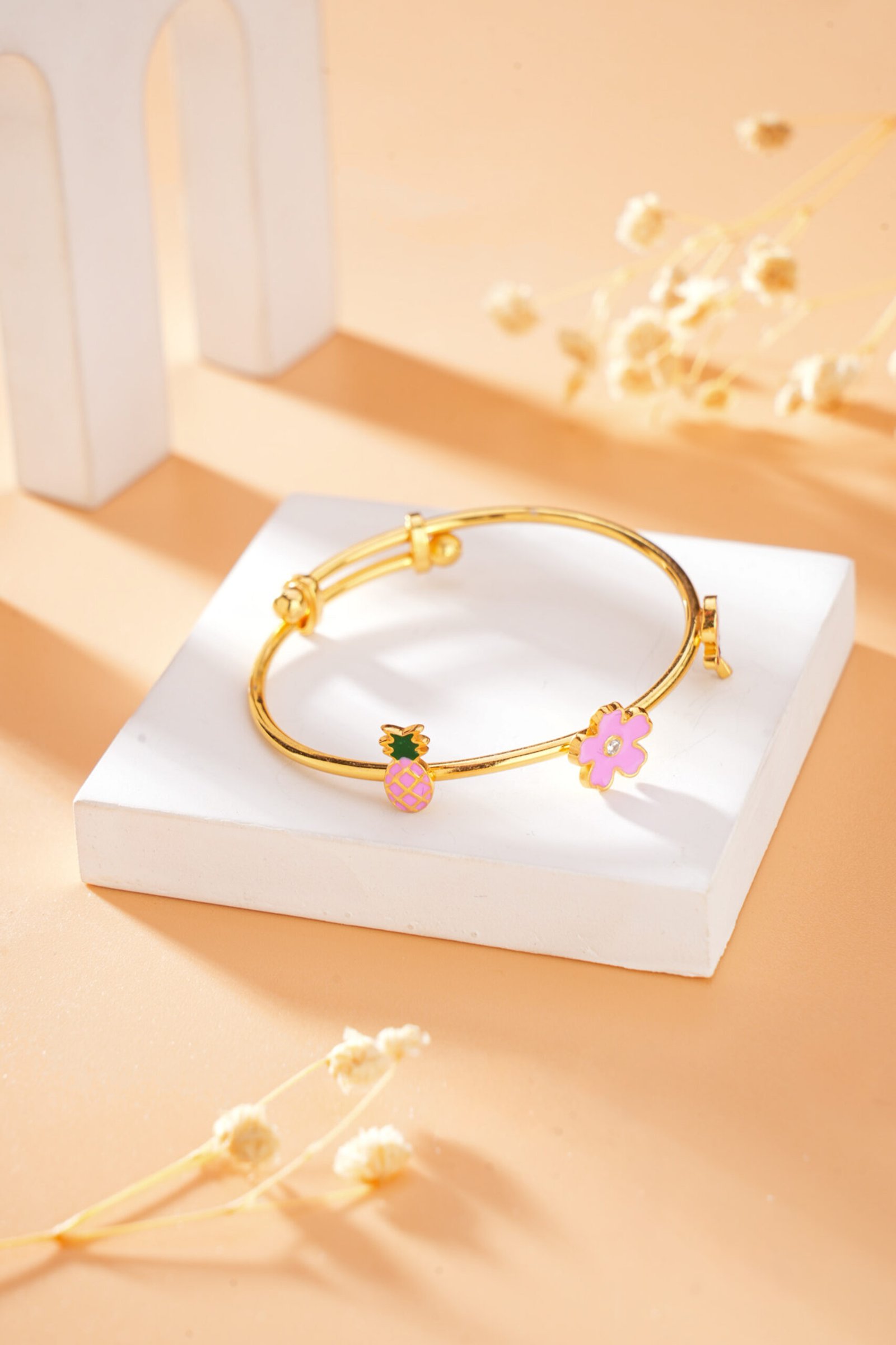 This enchanting cuff is tipped with two delightful charms: a sweet, sparkling flower (Bloom) and a fun, colourful pineapple, all finished with bright enamel.